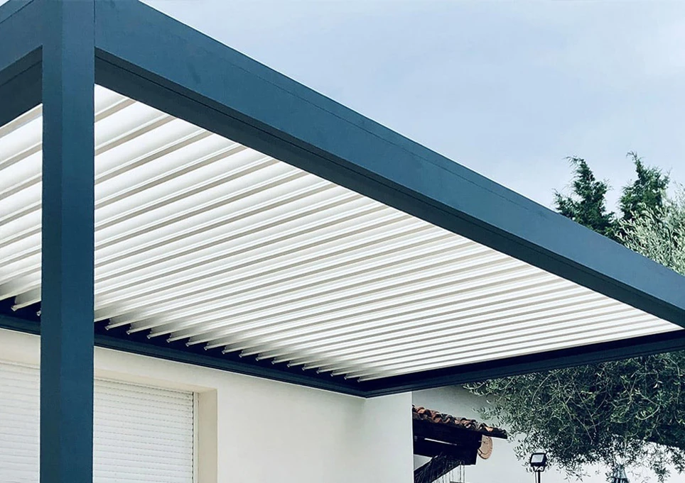 Structure en aluminium avec lames motorisées réglables qui vous procure une maîtrise fine de l'ensoleillement et de la ventilation selon vos besoins.