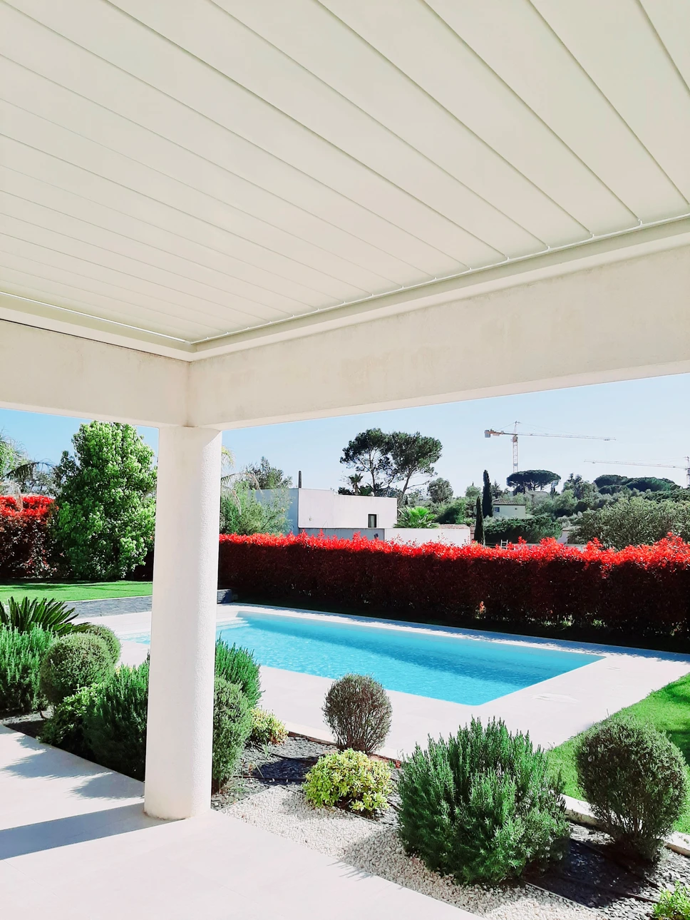 Structure en aluminium avec lames motorisées réglables qui vous procure une maîtrise fine de l'ensoleillement et de la ventilation selon vos besoins.