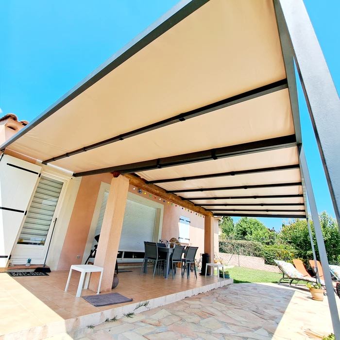 Système de couverture textile mobile qui vous procure une protection solaire modulable rapidement selon vos envies et les conditions météorologiques.